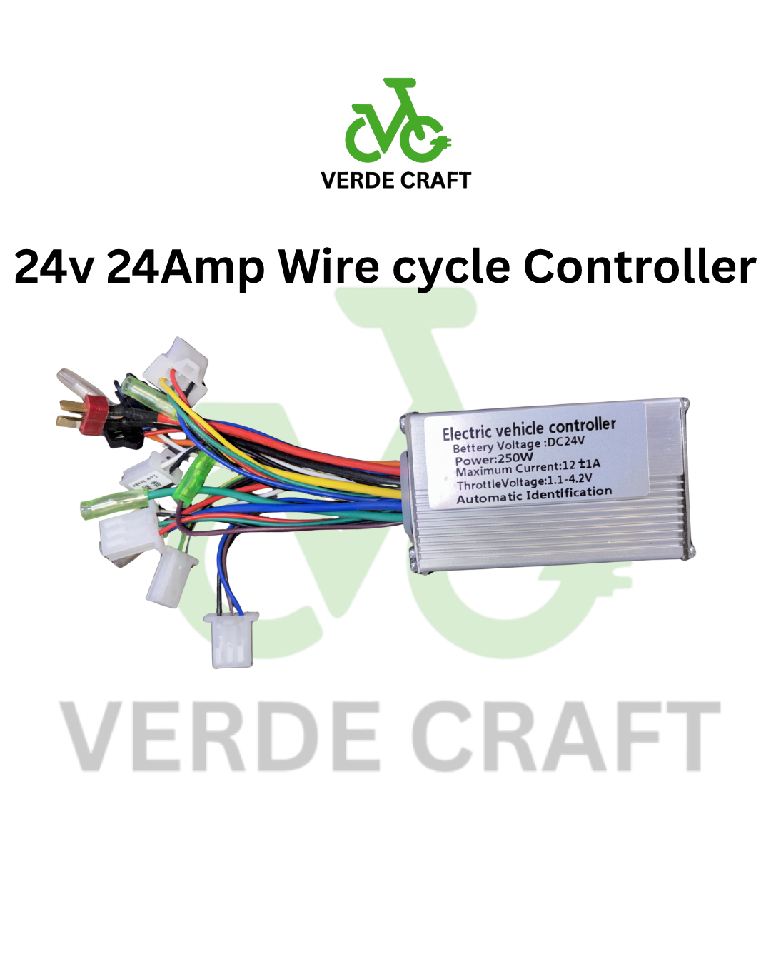 The 24V 24Amp Wired Cycle Controller from Verde Craft is a compact and efficient motor controller designed for electric bicycles (e-bikes) and low-voltage EV applications. It ensures smooth power delivery, stable speed control, and reliable performance for daily use. Built with durable components and a wired connection system, this controller is ideal for replacement or upgrading existing e-bike systems.