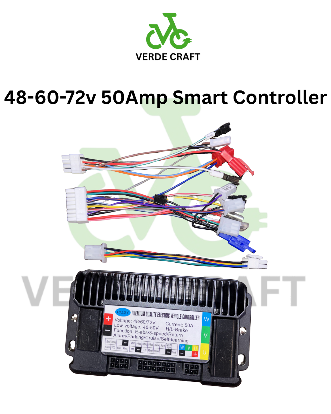 The 48V/60V/72V 50Amp Smart Controller from Verde Craft is a high-power motor controller designed for electric scooters and e-bikes requiring superior performance. With a strong 50Amp output, it delivers enhanced acceleration, higher torque, and stable speed control. Built with advanced smart technology and durable components, this controller ensures efficient power management, smooth riding experience, and long-lasting reliability across multiple voltage systems.